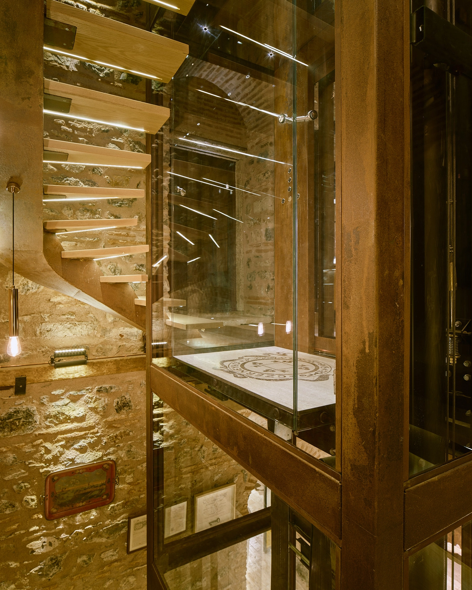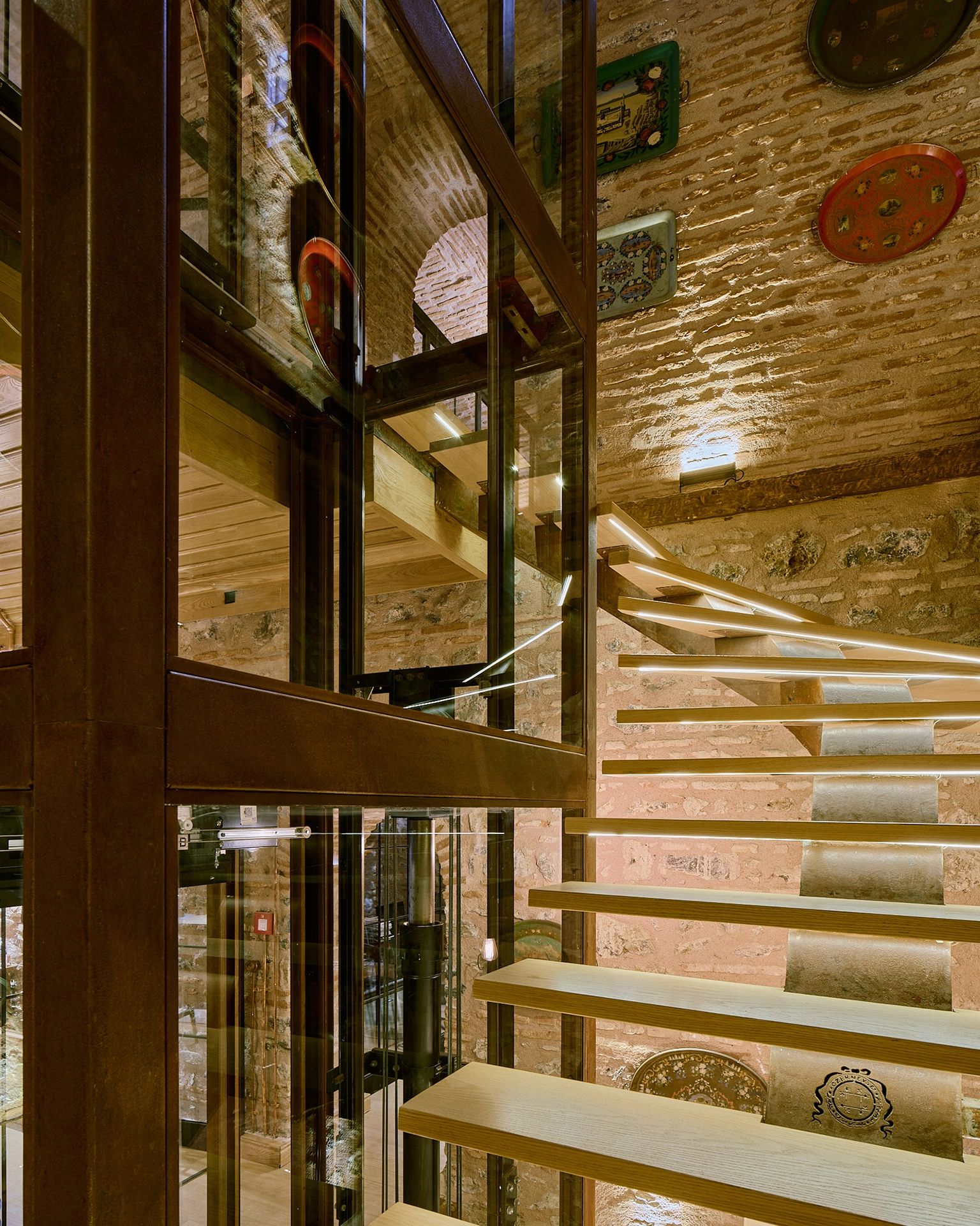 Asansör kabininde özel işçilik gerektiren yekpare cam paneller kullanarak mekânın tarihi atmosferinin kullanıcılar tarafından kesintisizce algılanmasını hedefledik. Böylece yapı içerisindeki taş duvarlar, sanat eserleri ve mimari detaylarla kesintisiz bir görsel ilişki kuruldu. Cam asansörün sağladığı şeffaflık burada bizim için yalnızca estetik bir tercih değil; kullanıcı ile yapının tarihsel katmanları arasında güçlü bir bağ oluşturan bilinçli bir tasarım yaklaşımı oldu.