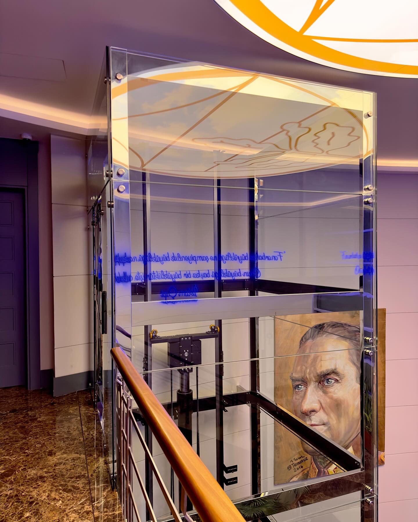 Hidrolik asansör sistemiyle hem güvenli hem de konforlu bir kullanıcı deneyimi sunan SNC Glass modelinin özel bir uyarlaması olan asansörümüz minimalist tasarımı ve niş malzeme seçimiyle beğeni topladı.